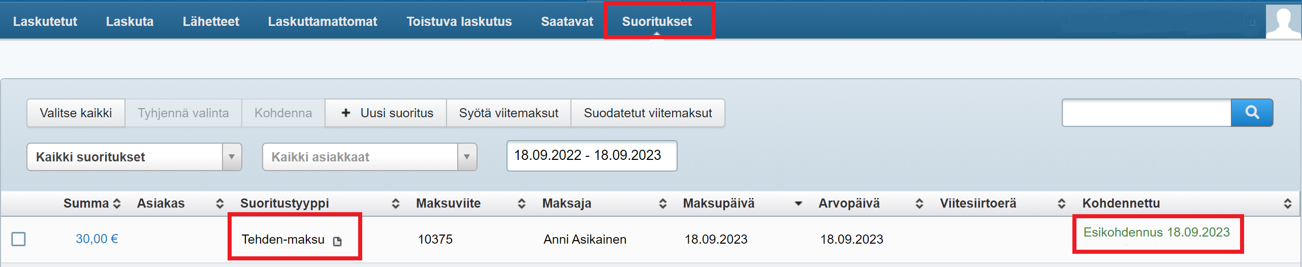 Kun asiakas maksaa laskun avoimen summan, myös se kohdentuu laskulle.