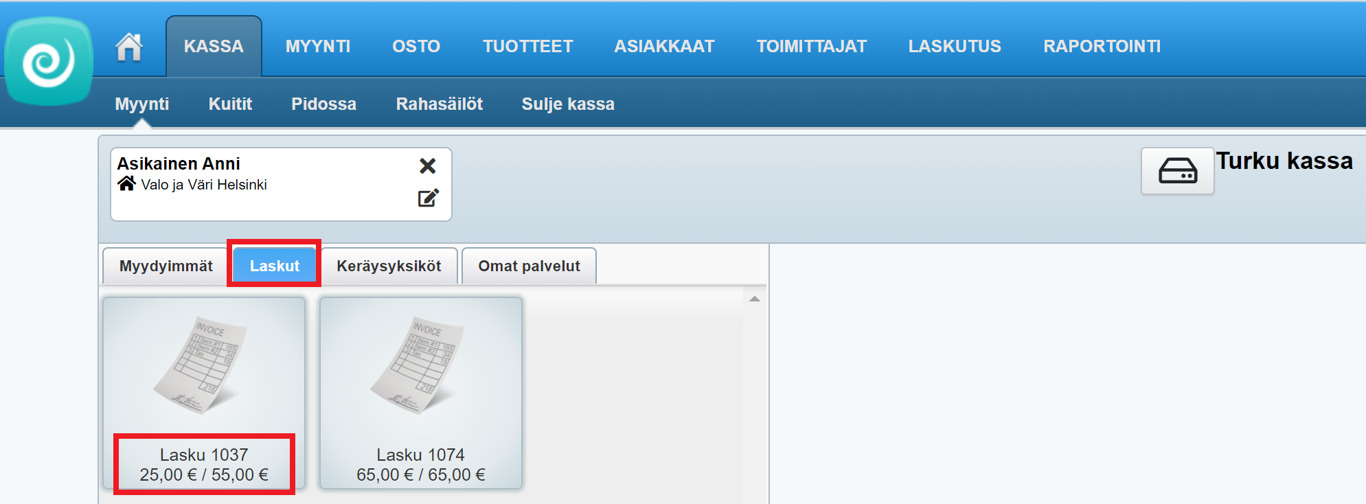 Toinen vaihtoehto on mennä suoraan Kassa-ohjelmaan ja valita asiakas. Tämän jälkeen voit avata kassan Laskut-välilehden ja klikata sieltä asiakkaan maksamattomat laskut työkuitille.