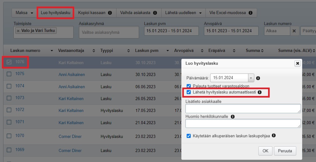 - Hyvitä alkuperäinen, laskutuspalvelulle siirtynyt lasku. Kun luot hyvityslaskua, muista valita Lähetä hyvityslasku automaattisesti -kohta. Muussa tapauksessa hyvityslasku ei siirry integraatiossa eikä laskutuspalvelu tiedä, että lasku on hyvitetty:
