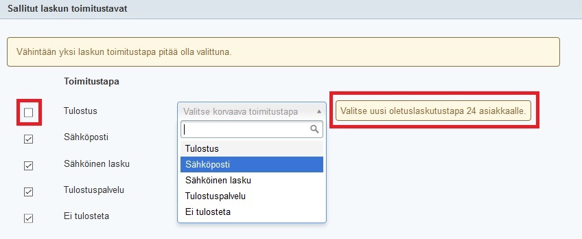 Viimeistä vaihtoehtoa kannattaa käyttää, jos otat käyttöön jonkin integroidun laskutuspalvelun ja haluat poistaa käytöstä ylimääräisiä toimitustapoja. Integroidut laskun toimitustavat täytyy ensin sallia, ja vasta sen jälkeen ne ovat valittavissa esim. asiakkaan tiedoissa. Jos haluat esimerkiksi lopettaa Tulostus-toimitustavan käytön ja ottaa kaikille Tulostus-toimitustavan valinneille asiakkaille käyttöön Sähköposti-toimitustavan, toimi seuraavasti: