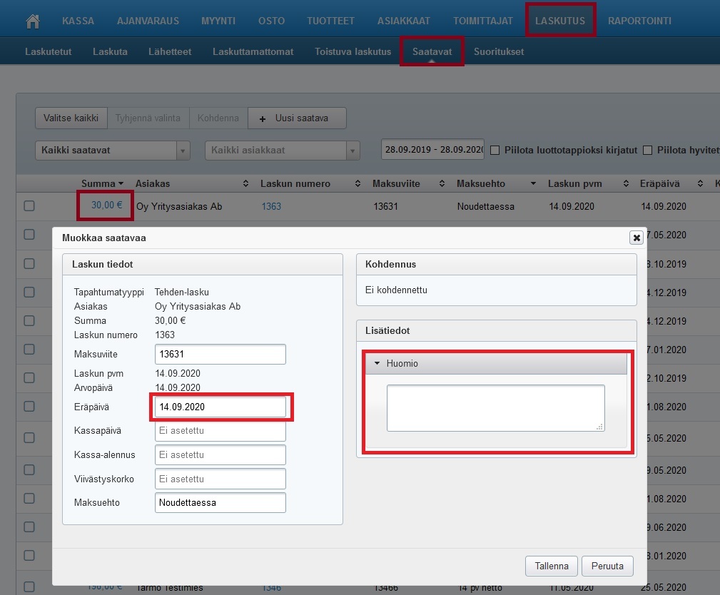 - Valitse aukeavassa ikkunassa Muokkaa. Valitse uusi eräpäivä. Kannattaa myös kirjoittaa Huomio-kenttään jonkinlainen selitys eräpäivän siirrosta ja uusi eräpäivä.