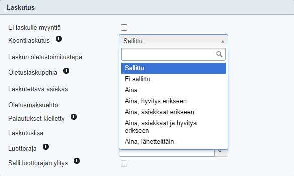 Kunkin asiakkaan tiedoissa on mahdollisuus valita, hyväksytäänkö koontilaskutus kyseiselle asiakkaalle (katso myös Uuden asiakkaan luonti). Oletuksena koontilaskutus on käytössä kaikilla asiakkailla. Jos asiakas on julkishallinnon asiakas, koontilaskutus on oletuksena estetty, mutta voidaan asiakaskortilla sallia lähetteittäin (eli kustakin lähetteestä luodaan erillinen lasku). Koontilaskutuksen asiakaskortilla valittavia vaihtoehtoja ovat: