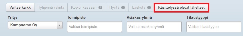 Käsiteltävinä olevien laskuttamattomien laskujen tilaa voi käsittelyn aikana tarkastella Laskuttamattomat-sivun Käsittelyssä olevat lähetteet -painiketta klikkaamalla: