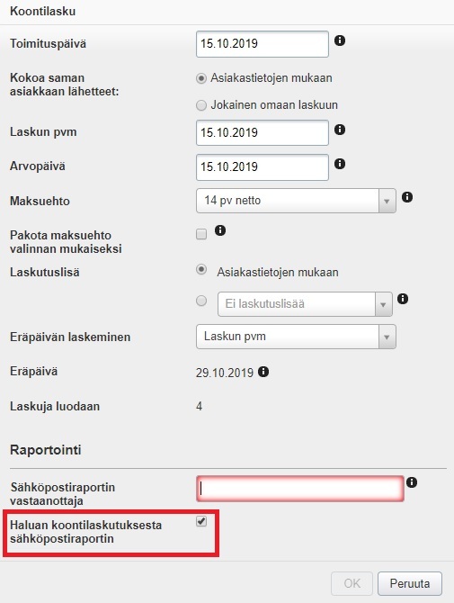 Tarvittaessa voi myös ajastaa koontilaskujen luonnin ja lähetyksen. Lue lisää: Koontilaskutuksen ajastaminen