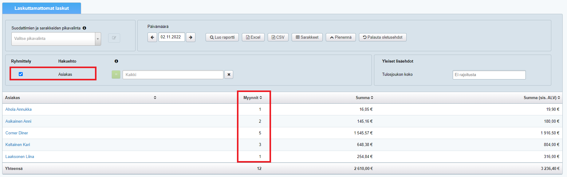 Laskuttamattomia laskuja voi tarkastella myös Laskuttamattomat laskut -raportilla, jossa laskut voi ryhmitellä asiakaskohtaisesti:
