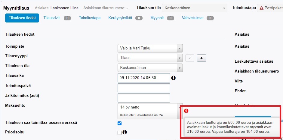 Jos annat laskutusasiakkaalle luottorajan, ohjelma joko estää laskulle myynnin tai varoittaa luottorajan ylityksestä, kun asiakkaan koontilaskutettavien myyntien ja maksamattomien laskujen veroton summa ylittää tänne merkityn luottorajan. Voit myös asettaa asiakaskohtaisen luottorajan haluamasi asiakkaan asiakaskortilla. Kun luot asiakkaalle myyntitilausta, näet asiakkaan vapaan limitin pitämällä hiirtä Maksuehto-kentän vierellä olevan infokuvakkeen päällä: