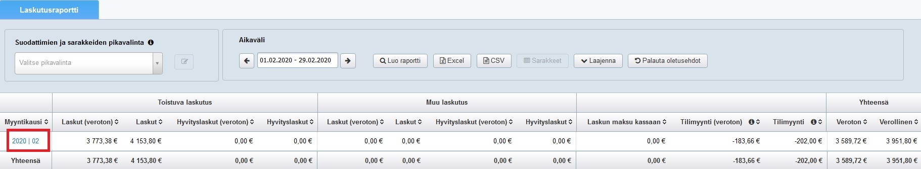 - Jos haluat nähdä tarkemmin, minkä laskutusprofiilien laskutuksesta summa koostuu, klikkaa Myyntikausi-sarakkeessa olevaa lukua.