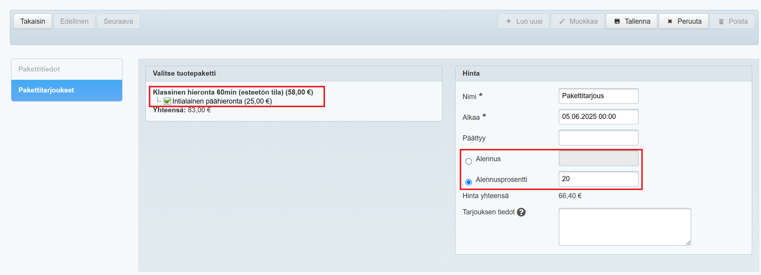 - Luo uusi tarjous painikkeella. Rasti puusta lisäpalvelu "Intialainen päähieronta" ja anna euro- tai prosenttimääräinen alennus palveluiden yhteenlaskettuun hintaan.
