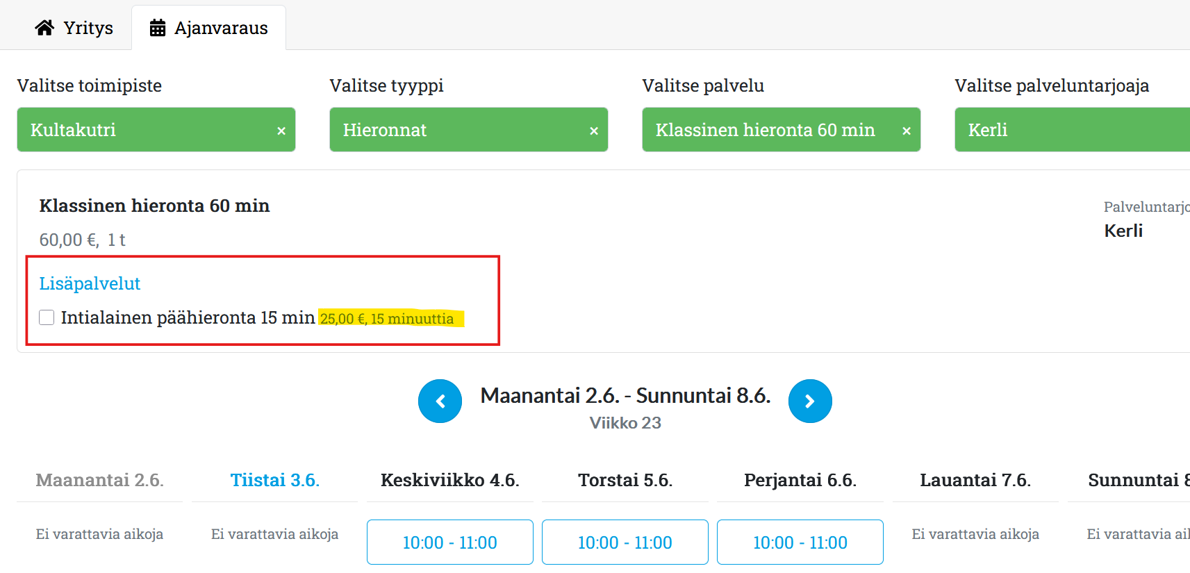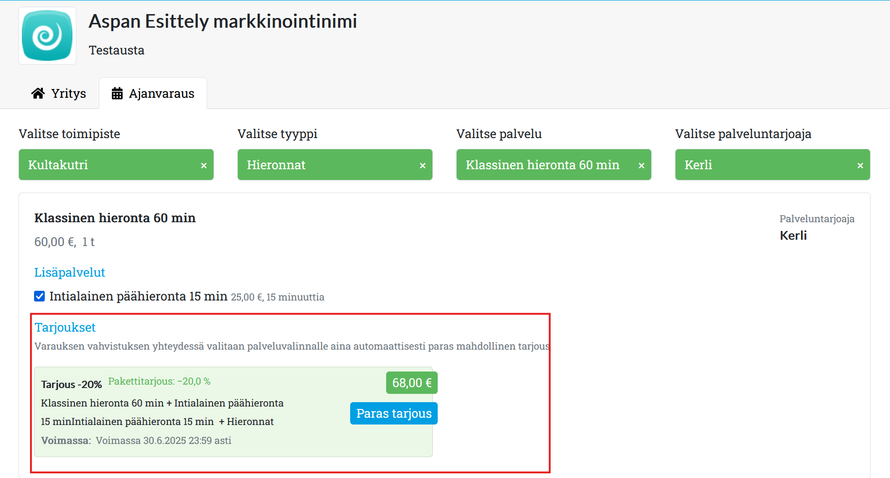 - Kun asiakas valitsee klassisen hieronnan Avoinna24-palvelussa, hän näkee myös lisäpalveluna myytävän päähieronnan tarjoushinnan ja tarjouksen tiedot (jos voimassa on useita tarjouksia, Avoinna24 ilmoittaa asiakkaalle, kun tämä on löytänyt parhaan tarjouksen):