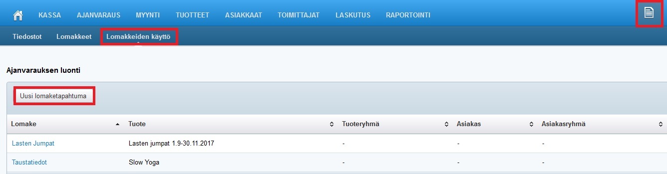 - Klikkaa paperiarkkikuvaketta päävalikossa ja siirry alavalikossa Lomakkeiden käyttö -osioon: