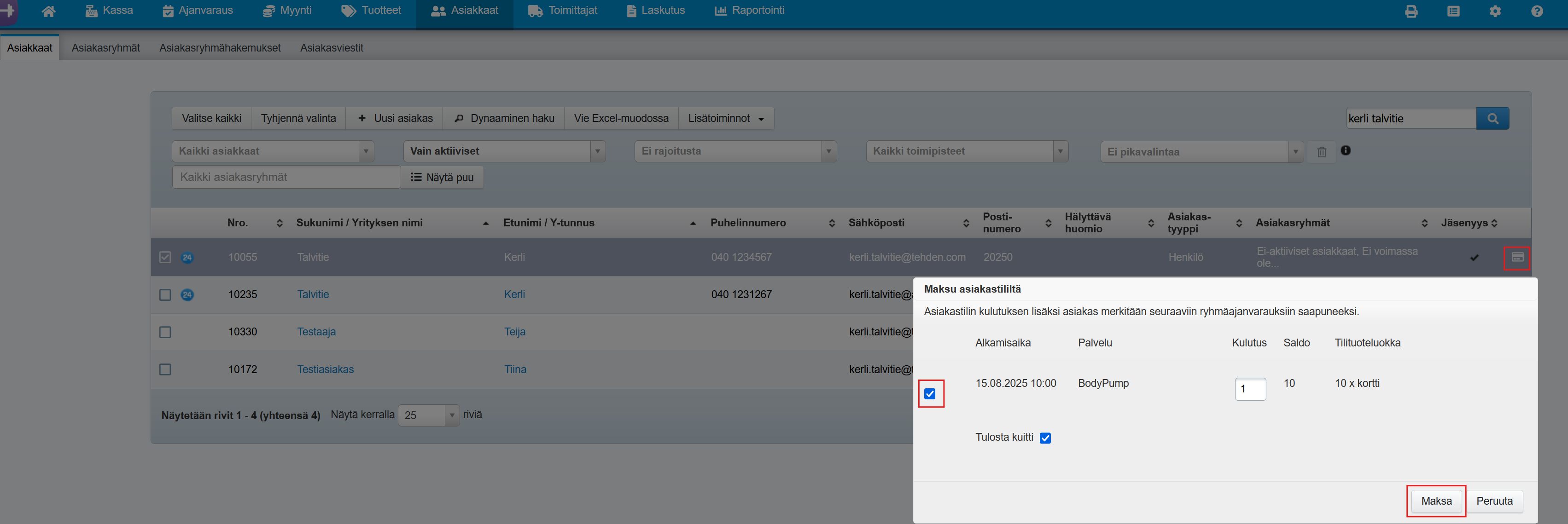 - Valitse avautuvassa ikkunassa oikea ajanvaraus ja napsauta Maksa-painiketta. Muista valita ajanvaraus, jotta maksumerkintä siirtyy myös ajanvarauksen tietoihin.