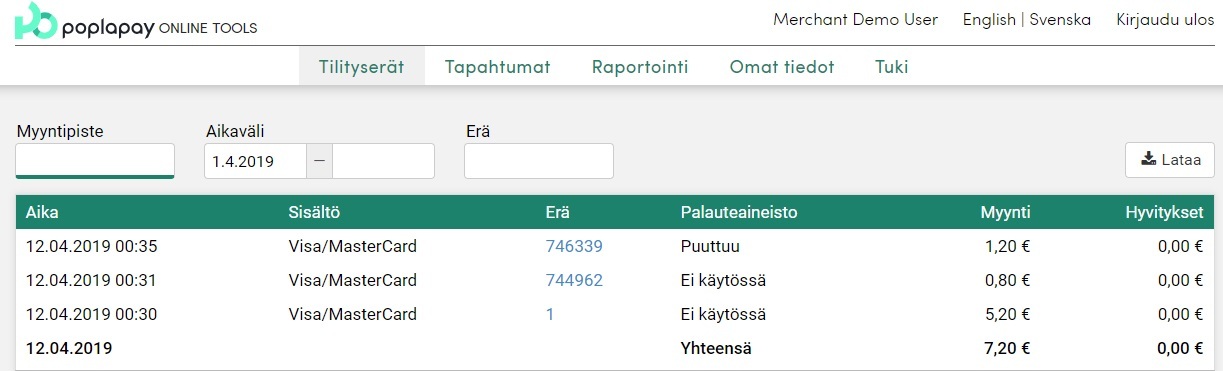 - Tilityserät-välilehdellä voi seurata tilityksiä ja mahdollisia hyvityksiä. Päivän korttimaksujen tilityserät muodostuvat ja siirretään pankkiin seuraavana yönä. Kunkin maksupäätteen päivän tilityserä näkyy omalla rivillään: