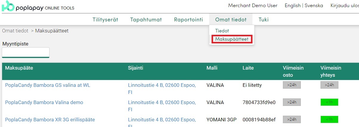 - Maksupäätevälilehdellä voi tarkistaa, onko maksupääte verkkoyhteydessä. Jos Viimeisin yhteys -sarake on vihreä, yhteys on kunnossa. Jos Laite-sarakkeessa on viesti Ei liitetty, maksupääte ei ole yhteydessä verkkoon.
