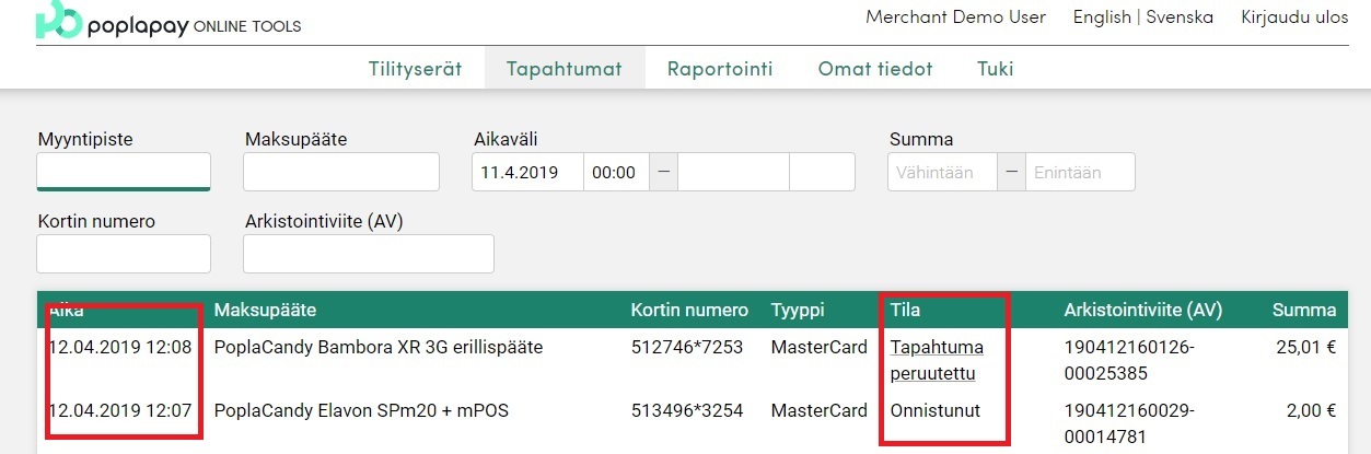 - Tapahtumat-välilehdeltä näet, onko maksutapahtuma onnistunut. Jos yritykselläsi on käytössä useita maksupäätteitä, kaikkien maksutapahtumat näkyvät samassa taulukossa. Jos tila on muu kuin Onnistunut, tilan nimeä klikkaamalla saat lisätietoja tapahtumasta.