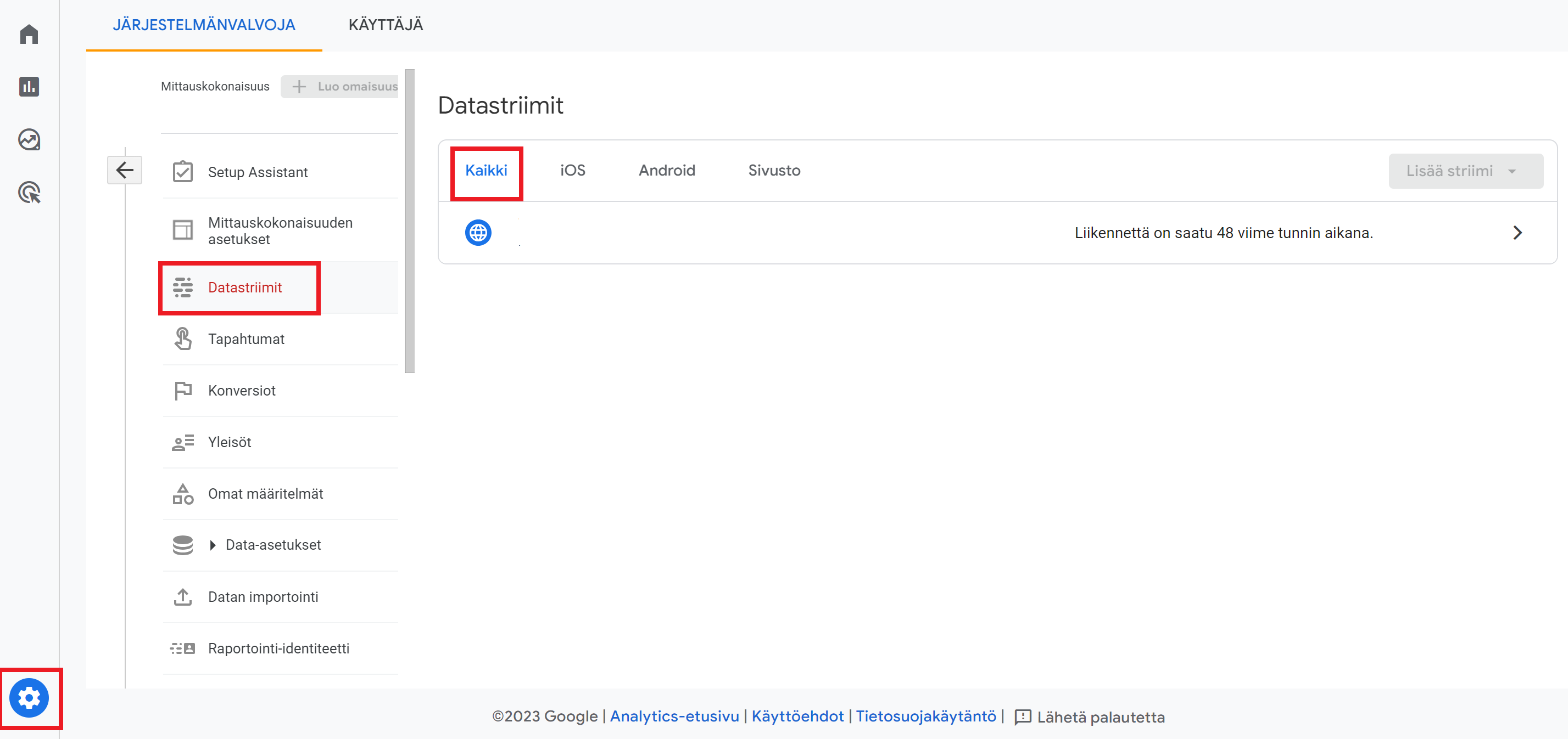 - Kopioi seitsemännumeroinen Google Tag Google Analytics -tilisi tiedoista: siirry rataskuvakkeesta Järjestelmänvalvoja/Admin-näkymään, josta löydät GA4-koodin Datastriimit/Datastreams-välilehdeltä:
