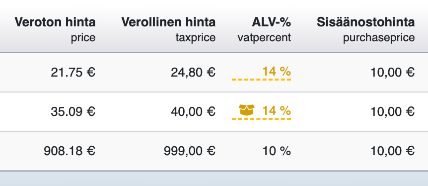 Huomioi hintoja päivittäessäsi, että jos tuotteen ensisijainen hinta on veroton, alv-prosentin nousu siirtyy suoraan lopulliseen hintaan, eli erillistä hinnankorotusta ei välttämättä tarvita. Jos ensisijaisena hintana käytetään verollista hintaa, korkeampaan alv-kantaan siirtyminen pienentää tuotteen verotonta hintaa.