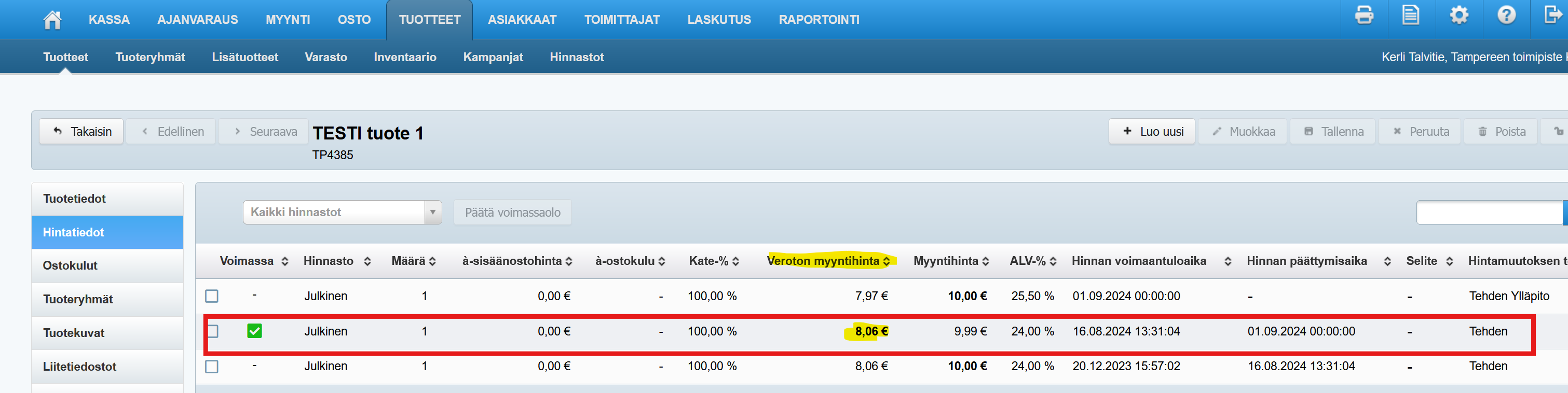 - Tallenna ja aloita tuonti. Hintojen ensisijaisuus päivittyy Tehdeniin, ja voit käydä tarkistamassa sen jonkin tuotteen Hintatiedot-välilehdeltä: