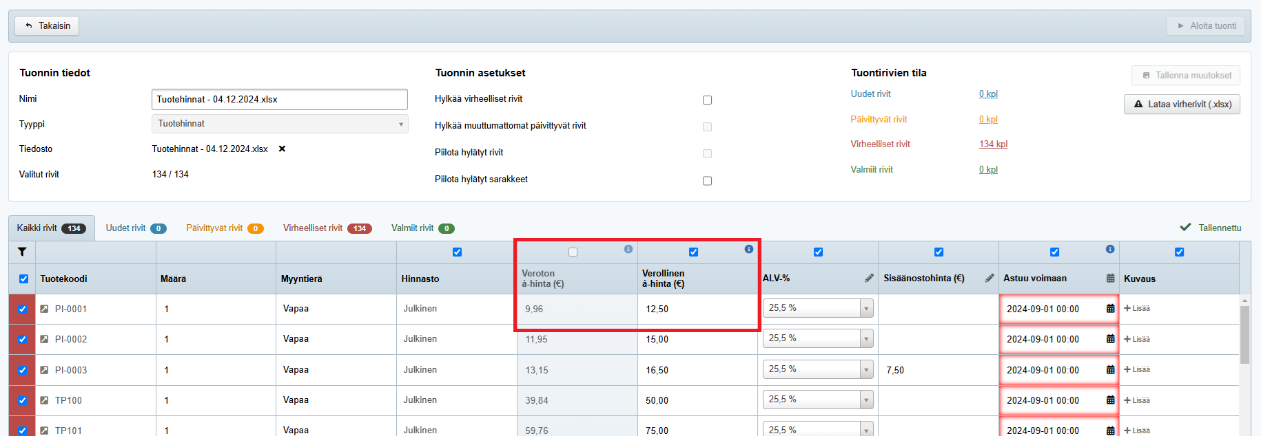 Tehdenin tuontityökalu on tehokas työkalu, mikäli yrityksessäsi halutaan muuttaa tuotteiden hintoja massana alv-muutoksen yhteydessä tai sen jälkeen. Hintojen päivittämisessä tuontityökalulla kannattaa huomioida tuotteen ensisijaisen hinnan (verollinen vai veroton) vaikutus siihen, paljonko tuotteen hinta verokannan muutoksen ja mahdollisen hinnankorotuksen yhteisvaikutuksesta muuttuu. Alta löydät ohjeet siihen, miten hintojen ensisijaisuutta voi tarvittaessa muuttaa tuontityökalulla.