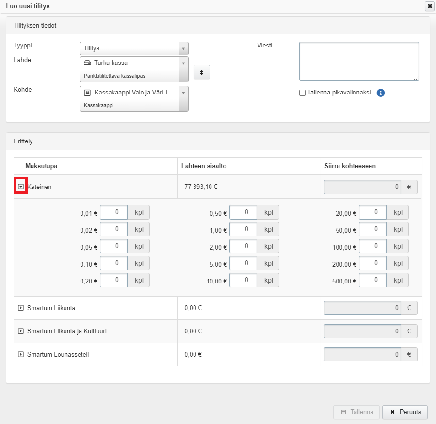 - Rahaerotellussa kassalippaassa klikkaa käteisrivin alussa olevaa nuolimerkkiä ja syötä kassalippaasta pois ottamiesi kolikoiden ja seteleiden lukumäärät oikeisiin kohtiin: