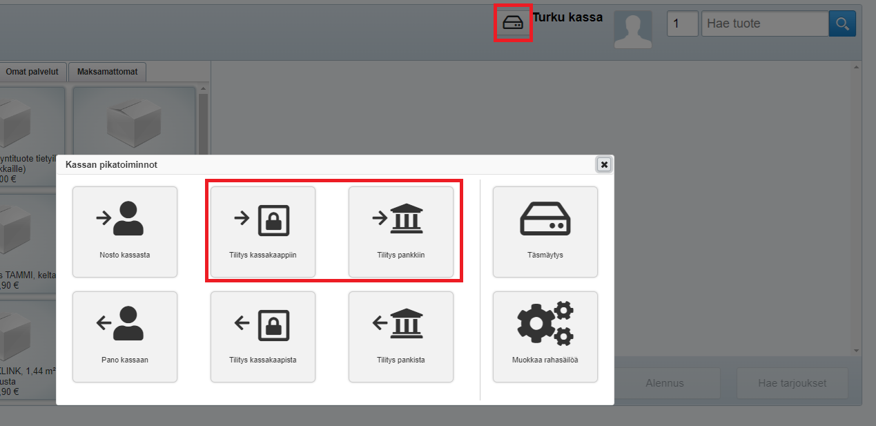 - Klikkaa Kassan pikatoiminnot -painiketta ja valitse Tilitys pankkiin tai Tilitys kassakaappiin, sen mukaan kumpaan haluat ylimääräiset rahat kassalippaasta siirtää:
