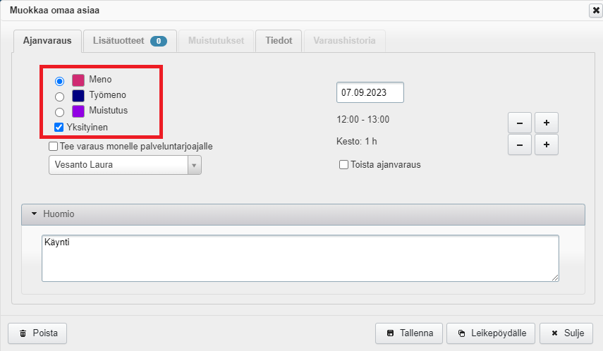 Huom! Yrityksen työntekijät voivat tehdä toisille käyttäjille ajanvarauksia palveluaikojen ulkopuolelle, työmenon tai muistutuksen kohdalle tai vaikka toisen ajanvarauksen päälle. Tehden varoittaa päällekkäisyydestä, mutta ei estä varauksen tekemistä.