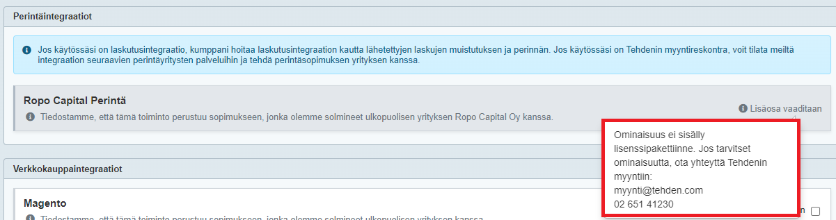 Kun integraatiolisäosa on lisätty tilaukseesi, yrityksen nimenkirjoitusoikeutettu pääkäyttäjä (käytännössä yleensä Tehden-ohjelmiston tilaaja) voi ottaa perintäintegraation käyttöön Tehdenissä seuraavia ohjeita noudattamalla. Perintäprosessista löytyy lisätietoa Perintä-ohjeesta.