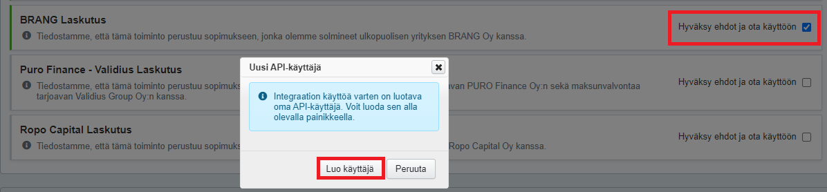 - Avautuvassa ikkunassa valitse Luo käyttäjä, jonka jälkeen sinulle luodaan automaattisesti uusi käyttäjätunnus ja salasana. Syötä nämä tiedot integraatiokumppanin palveluun.