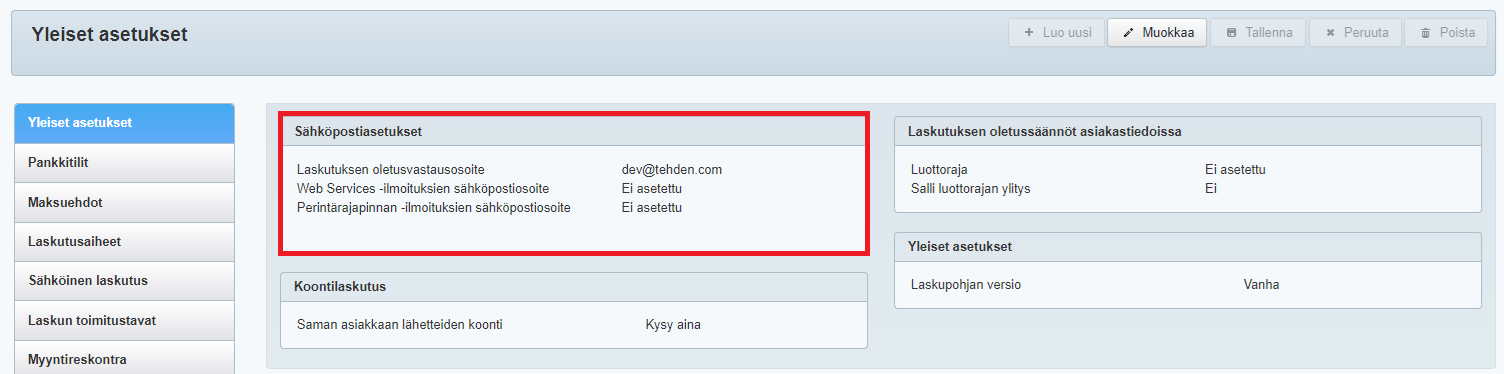 - Käy vielä Laskutusasetusten Yleisissä asetuksissa antamassa perintärajapinnan ilmoituksiin käytettävä sähköpostiosoite. Tähän osoitteeseen lähetetään kaikki sellaiset perintärajapintaan liittyvät virheilmoitukset, jotka käyttäjä voi itse korjata Tehdenin päässä: