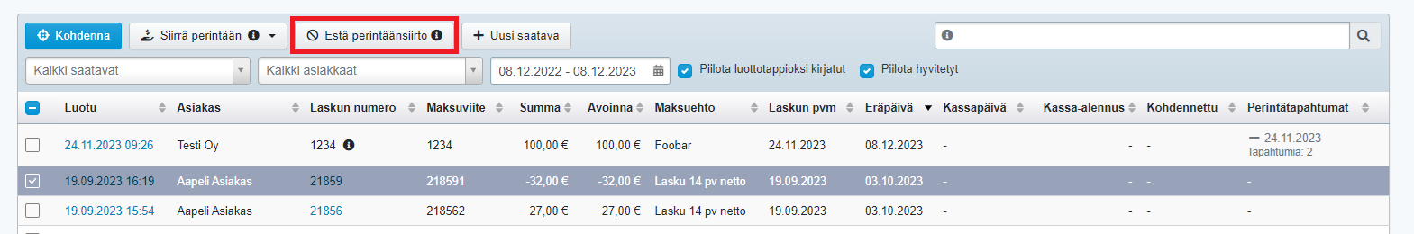 Jos käytössäsi on automaattinen perintään siirto ja haluat poistaa automaattisesta siirrosta valitsemasi avoimet laskut, voit valita laskut kohdassa Laskutus / Saatavat ja valita listalta haluamasi laskut ja sen valita Estä perintäänsiirto. Eston saa asetettua useammalle laskulle kerrallaan.