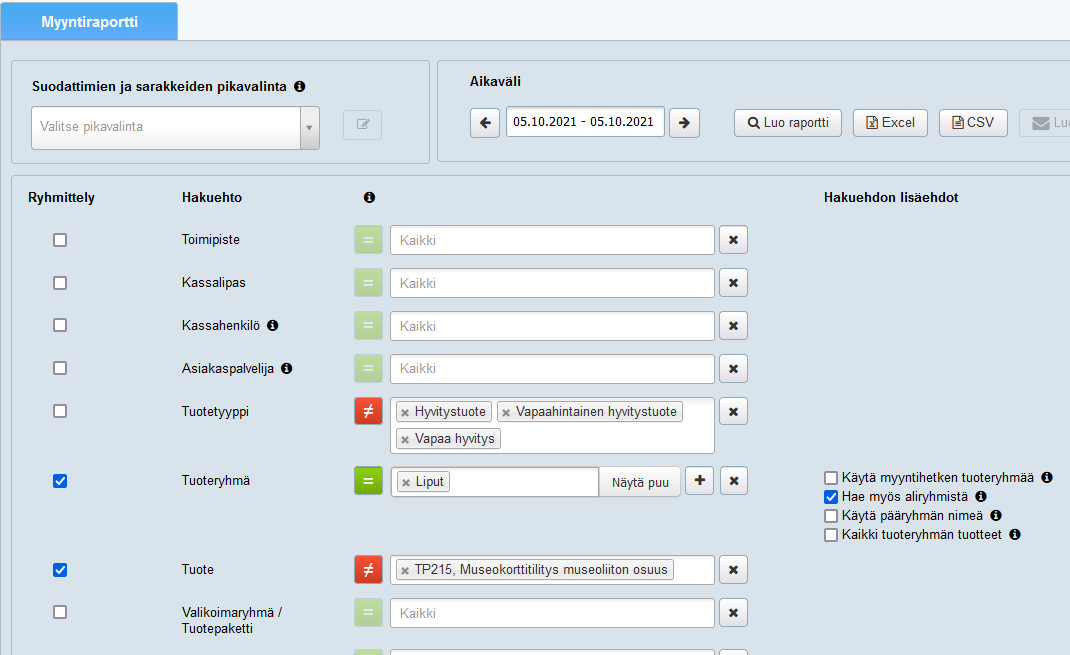 Jos halutaan nähdä vain uusien Museokorttien myynti, suodatetaan myyntiraportilta pois tuotteet, joiden tuotetyyppi on hyvitystuote tai vapaahintainen hyvitys. Pois suodatetaan myös museoliiton osuus, jolloin raportille jäävät vain myydyt museokortit sekä yksi tuote / Museokortin käyttö.