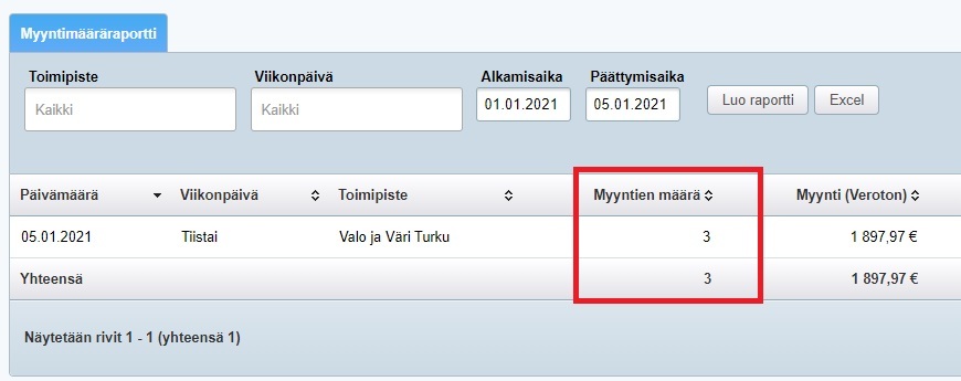 Koska raportin tavoitteena on antaa mahdollisimman tarkka arvio asiakasmäärästä, myyntimääräraportti ei sisällä esim. hyvityslaskuja, virhekuitteja ja muita palautuksia. Siksi myyntimääräraportilla näkyvä myyntien summa EI ole verrattavissa esim. myyntiraportin summaan. Myyntimääräraportti EI ole kirjanpidollinen raportti, eikä sitä kannata käyttää kokonaismyynnin tarkasteluun. Tähän tarkoitukseen kannattaa käyttää Myyntiraportti (Uusi) -raporttia.