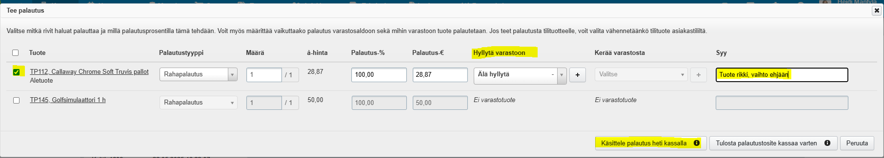 - Palautus voidaan käsitellä heti kassalla tai siitä voidaan tulostaa tosite myöhempää käsittelyä varten.