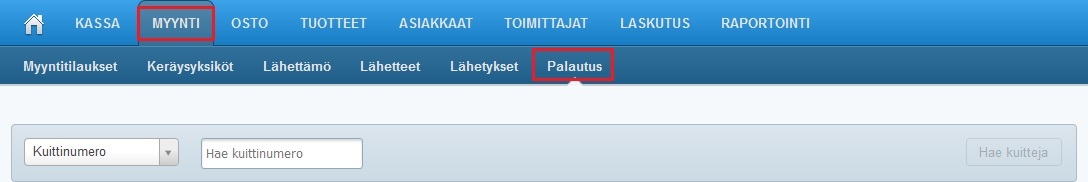 - Hae palautukseen liittyvä kuitti kuitin numerolla. Palautusta pääsee tekemään myös hakemaan oikean tositteen esim. Myynti-ohjelman Lähetteet-osiosta tai Kassa-ohjelman Kuitit-osiosta.