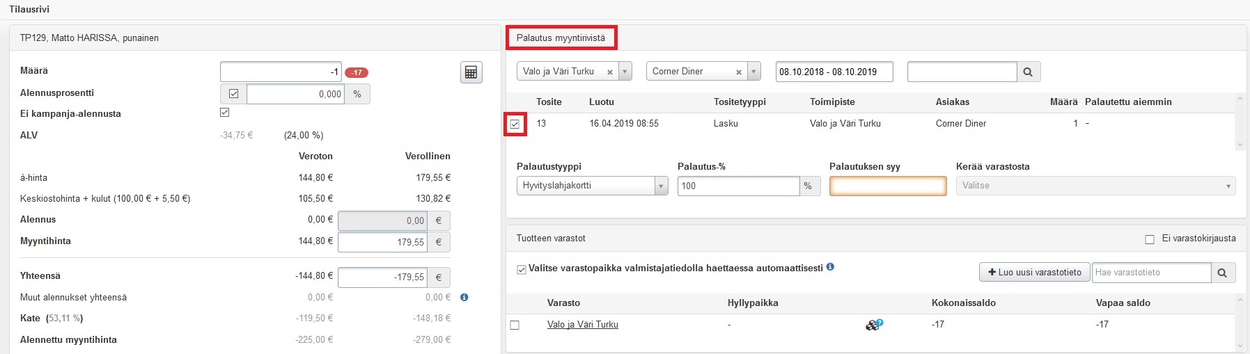 - Valitse kaikki palautettavat tilausrivit ja täytä niihin edellä kuvatut tiedot.