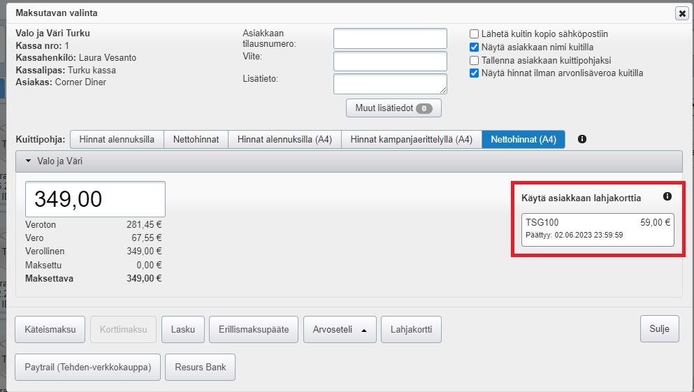 - Huom! Hyvitykset vähennetään kokonaissummasta vasta maksuvaiheessa. Näin toimitaan siksi, että jos samalla myyntitilauksella halutaan myös myydä asiakkaalle tuotteita, hyvityslahjakortin summa vähennetään tällöin muiden kuitilla olevien tuotteiden summasta. Jos myyntipalautus hyvitetään hyvityslahjakortilla eikä samalla myyntitilauksella myydä asiakkaalle muita tuotteita, jää myynnin summaksi kassalla 0 ja hyvityslahjakortti lisätään asiakkaan tietoihin. Kun asiakas seuraavan kerran ostaa tuotteita, hyvityslahjakortti voidaan valita kassalla maksutavaksi: