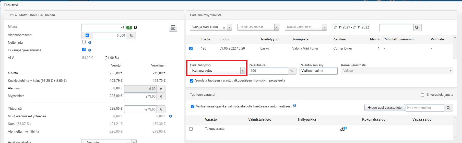 - Korvaavasta tuotteesta tehdään tavallinen myyntitilaus ja lasku. Kun asiakas palauttaa tuotteen, se käsitellään Tehdenissä luomalla uusi Takuupalautus-tyyppinen myyntitilaus. Tilaukselle lisätään palautettava tuote ja valitaan Palautus myyntirivistä -osiossa alkuperäisen myyntitilauksen vastaava rivi (palautustyyppi rahapalautus):