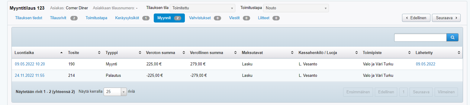 Kun tilaus merkitään valmiiksi ja käsitellään Maksu-painikkeen kautta, syntyy hyvityslasku, ja palautus löytyy myös alkuperäisen myyntitilauksen tiedoista: