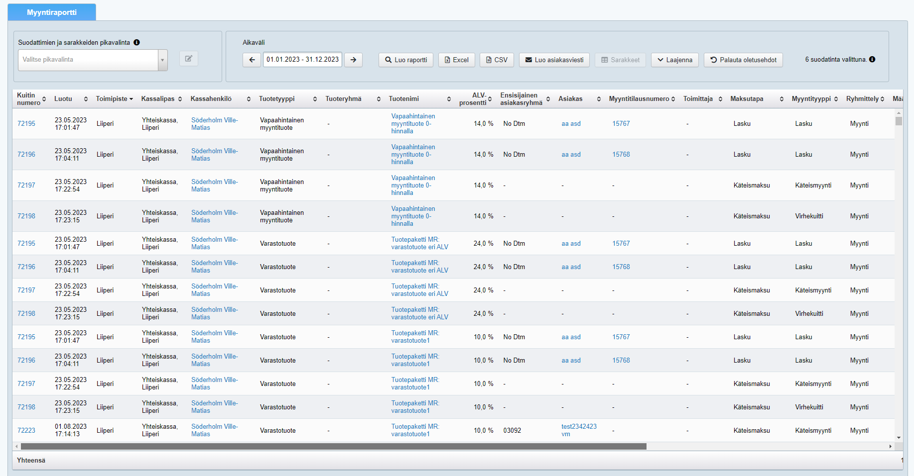 Raportti sisältää oletuksena valtavan määrän tietoa, joten raportin sarakkeita, lisäehtoja ja ryhmittelyä kannattaa säätää kulloisenkin tarpeen mukaan ja tallentaa toistuvasti tarvittavia raportteja pikavalinnaksi.