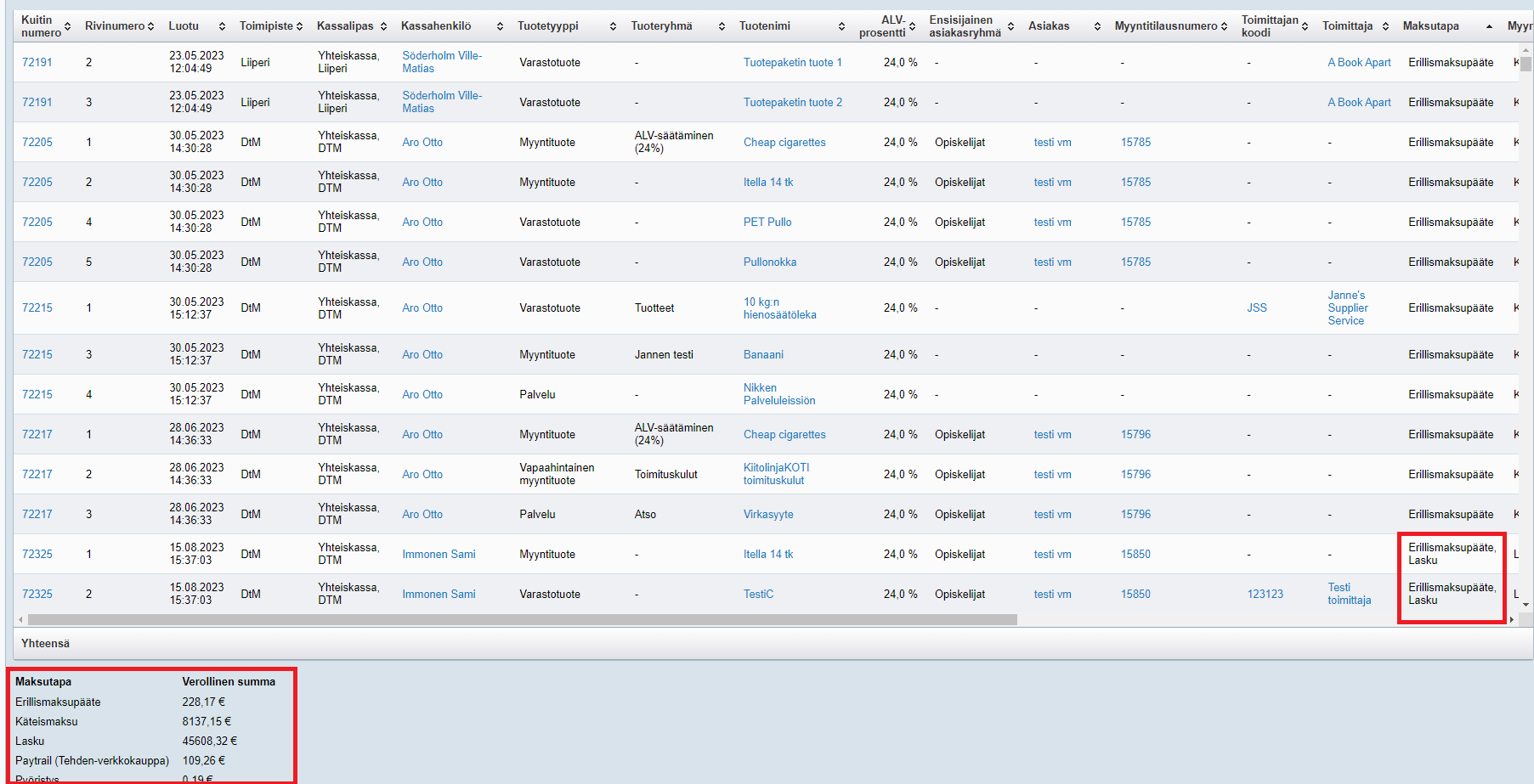 - Näytä summatason erittely maksutavoille -kohdan valitsemalla raportin alla näytetään erittely siitä, miten paljon maksuja milläkin maksutavoilla on otettu vastaan: