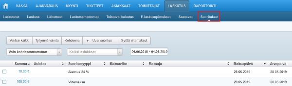 Pankin viitemaksuaineiston pohjalta muodostuu puolestaan lista suorituksista kohtaan Laskutus / Suoritukset. Mikäli saatavan ja suorituksen viitenumero ja summa vastaavat toisiaan, myyntireskontra kohdentaa saatavan ja suorituksen automaattisesti, kun viitemaksut syötetään ohjelmaan automatiikalla. Kun Suoritukset-välilehdelle saavutaan, sillä näytetään oletuksena vain kohdentamattomat suoritukset.