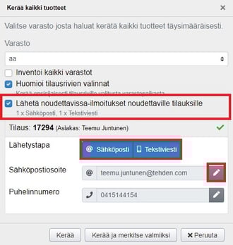 - Jos keräät Nouto-tyyppistä tilausta ja haluat lähettää asiakkaalle noutoilmoituksen, se onnistuu samalla: