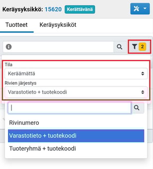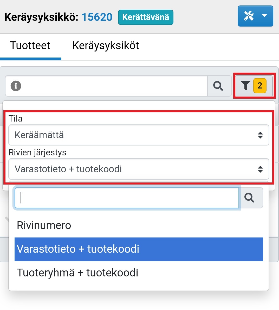 - Suppilokuvakkeesta napauttamalla voi suodattaa näkyviin vain tietyssä tilassa olevat keräilyrivit ja järjestää rivejä. Jos yrityksessäsi on useita varastoja, tuotteet kannattaa ehdottomasti järjestää varastotiedon tai tuoteryhmän mukaan: