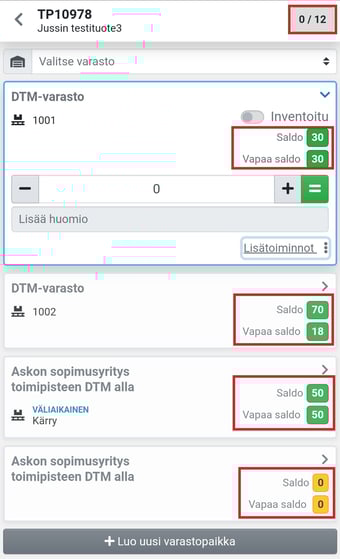 - Kun napautat tuoteriviä, näet missä varastossa (ja mahdollisesti millä hyllypaikalla) tuotetta on ja montako sitä täytyy tilaukseen kerätä: