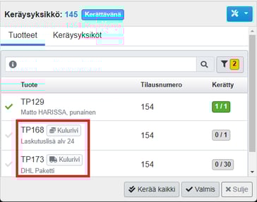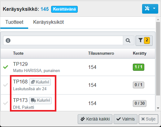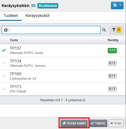 - Kun kaikki tuotteet on kerätty, klikkaa Valmis -painiketta.