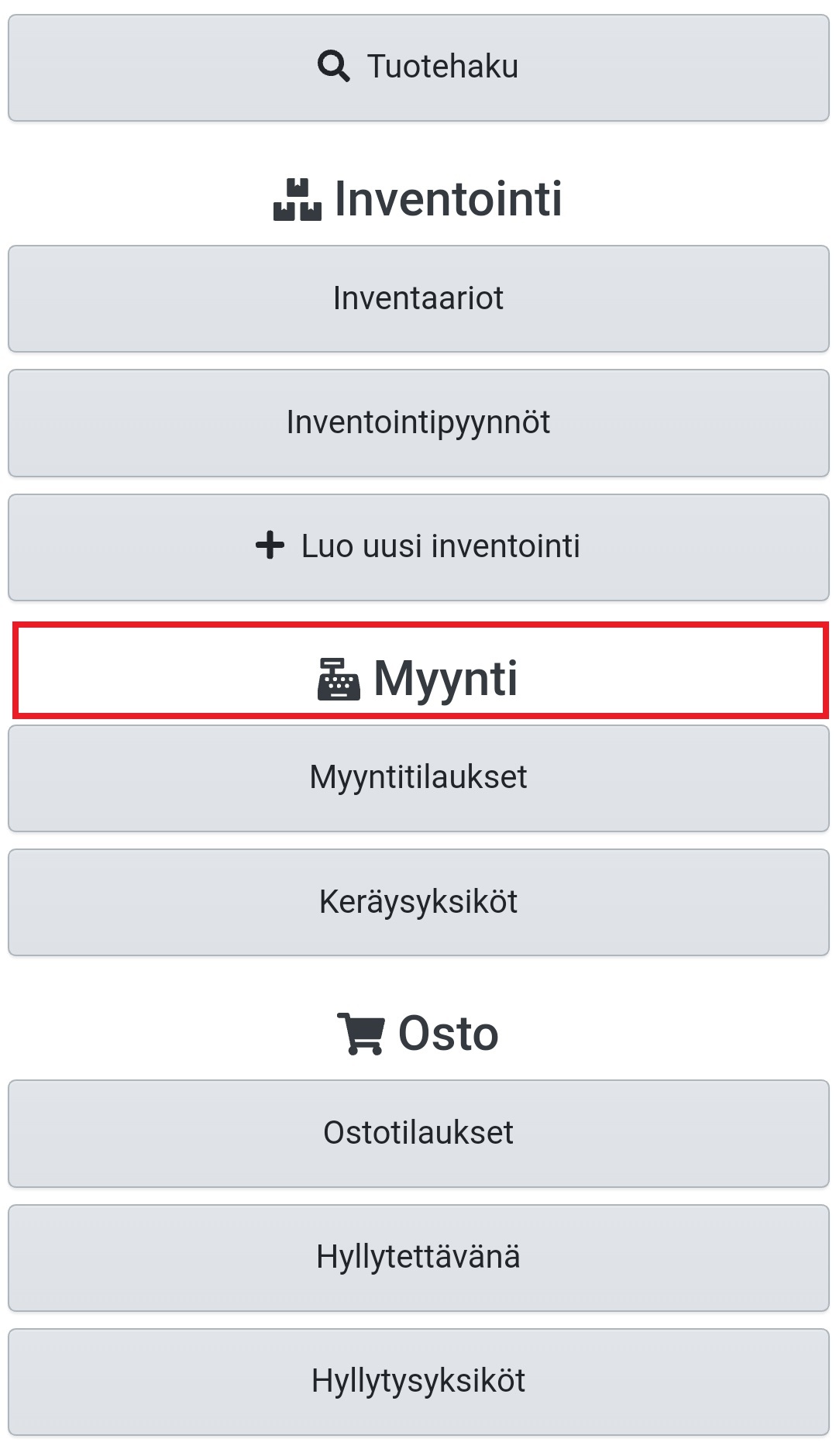 - Voit siirtyä sovellukseen keräilemään skannaamalla selaimella luodun QR-koodin. Voit myös etsiä oikean myyntitilauksen suoraan sovelluksesta: kun avaat sovelluksen, keräilyyn liittyvät vaihtoehdot löytyvät Myynti-otsikon alta: