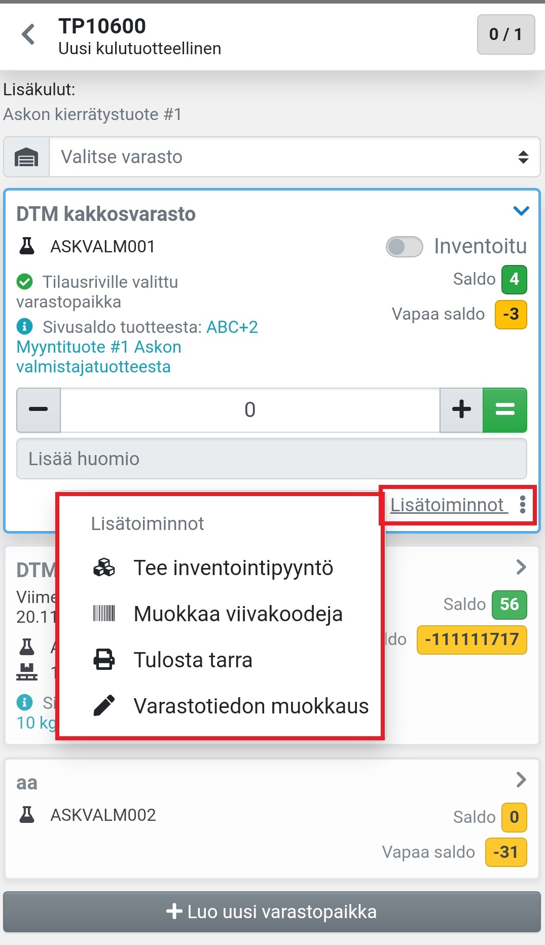 - Tarvittaessa pääset tuoterivin Lisätoiminnot-painikkeesta eli kolmesta pisteestä tekemään inventointipyynnön, muokkaamaan tuotteen viivakoodeja tai sen varastotietoja tai tulostamaan tuotetarroja: