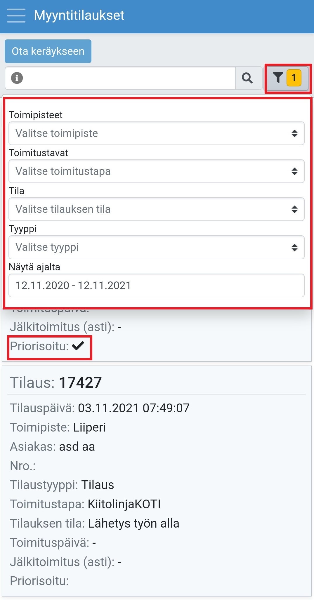 - Voit suodattaa näkymää napauttamalla suppilokuvaketta. Varastotyöntekijä voi esimerkiksi suodattaa ensin keräiltäväksi esim. Pikatoimitus-tyyppiset myyntitilaukset. Jos yrityksessäsi käytetään Priorisoitu-valintaa myyntitilauksilla, priorisoiduiksi merkityt myyntitilaukset nousevat listauksen kärkeen: