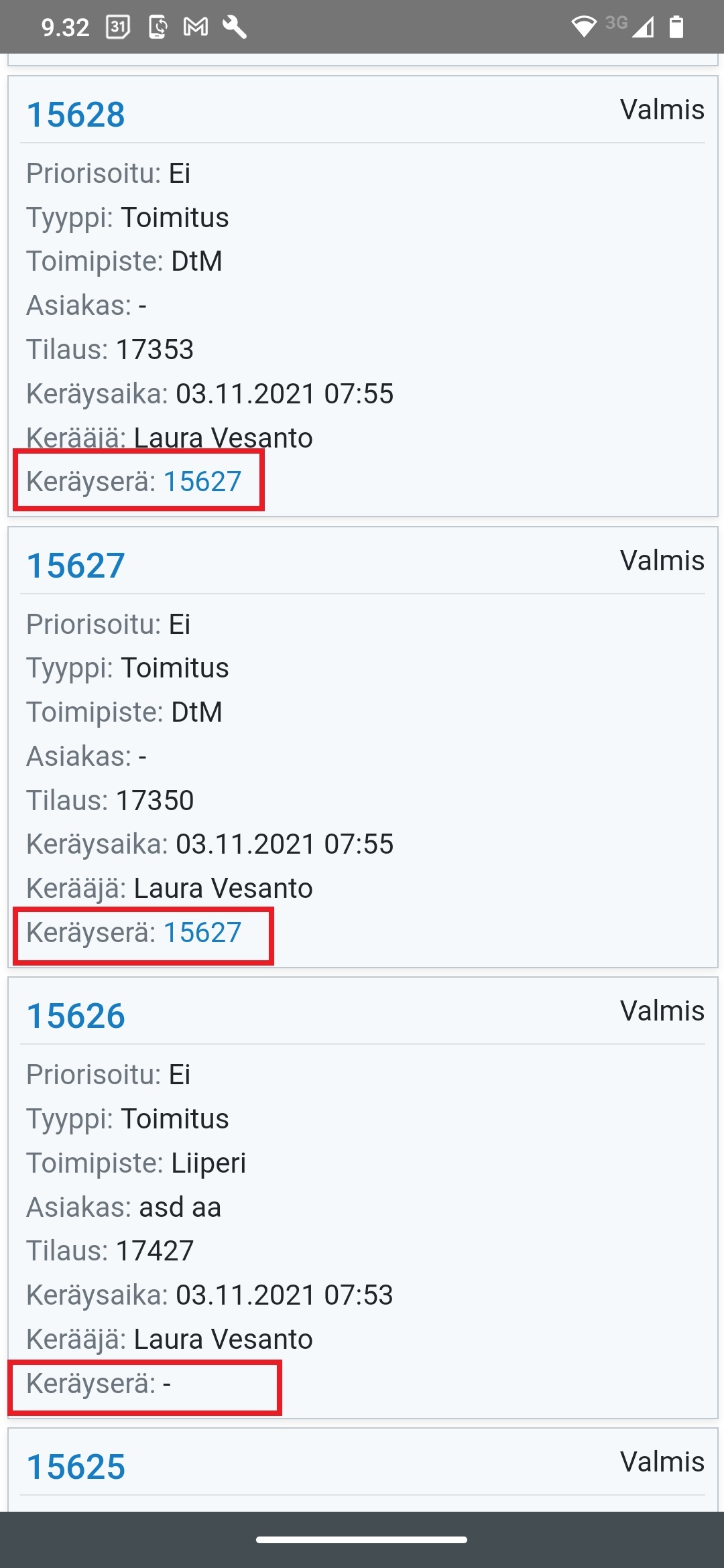 Jos otat keräykseen useamman myyntitilauksen kerralla, Tehden muodostaa näitä tilauksia yhdistämään keräyserän. Jos myyntitilausten keräily jää kesken eikä tilausta pystytä heti toimittamaan, voit jatkaa keräilyä myöhemmin. Sovelluksessa keräyserään pääsee Keräysyksiköt-näkymästä, Keräyserä -rivillä olevasta linkistä: