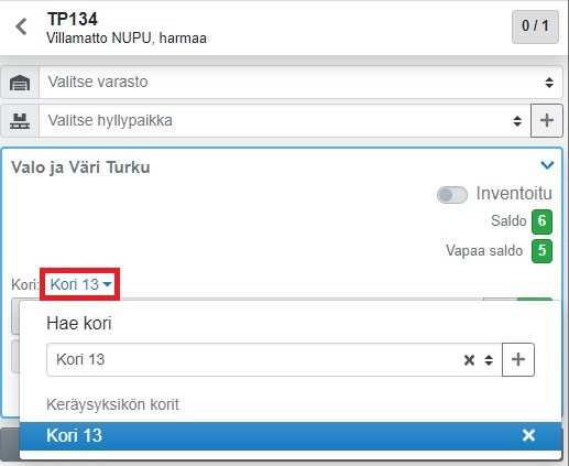 - Valitse kori ja merkitse Kerätty-kenttään koriin keräilemäsi määrä. Tehden siirtää sinut automaattisesti seuraavalle riville, jossa Kori-saraketta napauttamalla pääset valitsemaan joko saman korin, johon edellinen tuote kerättiin, tai tarvittaessa toisen korin: