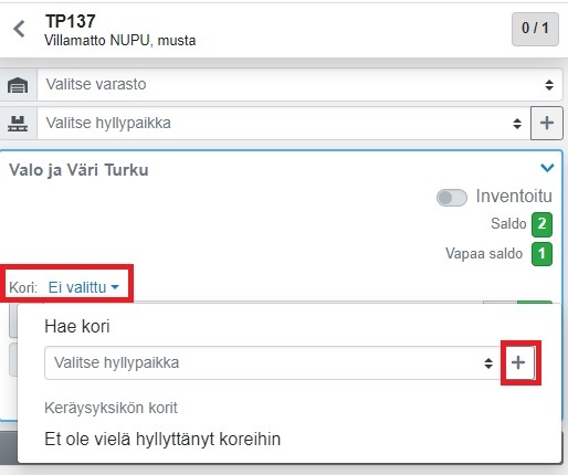 - Luo ensin avatussa keräilyssä väliaikainen hyllypaikka: napauta oikean varaston kohdalla Kori-sarakkeen Ei valittu -tekstiä, jonka kautta pääset luomaan uuden korin eli väliaikaisen hyllypaikan: